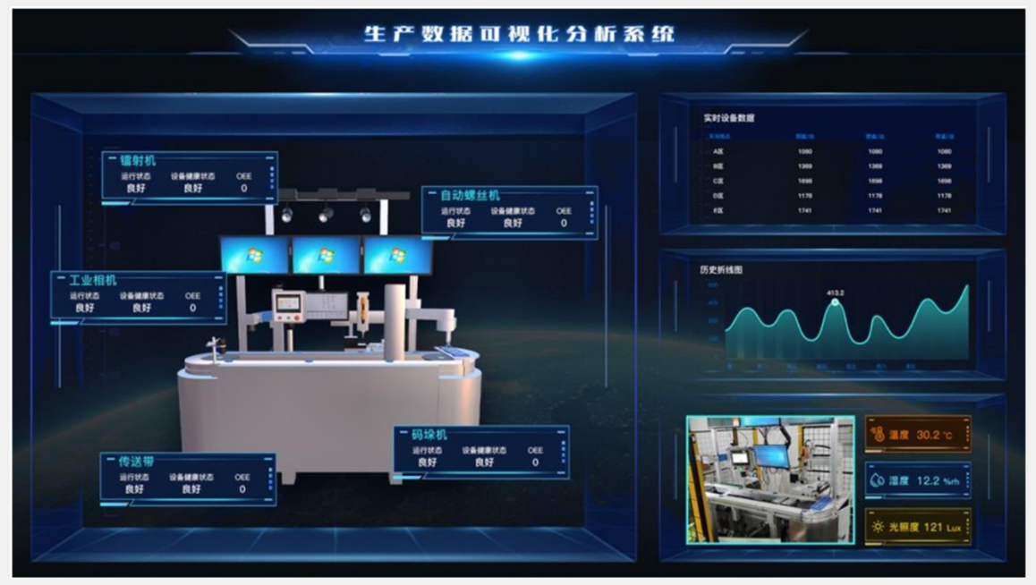 - 数字孪生技术能够为生产线上的每一台设备建立虚拟数字模型,实现“无人化、自动化”生产管理。管理者可以通过3D可视化,实时了解设备运行状态、生产数据、设备的OEE(整体设备效率)、产量、质量、能耗等重要指标。