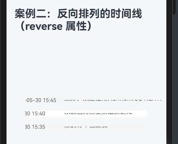 }通过本教程的两个部分,我们详细讲解了如何使用Column组件的reverse属性构建反向排列的时间线,包括: