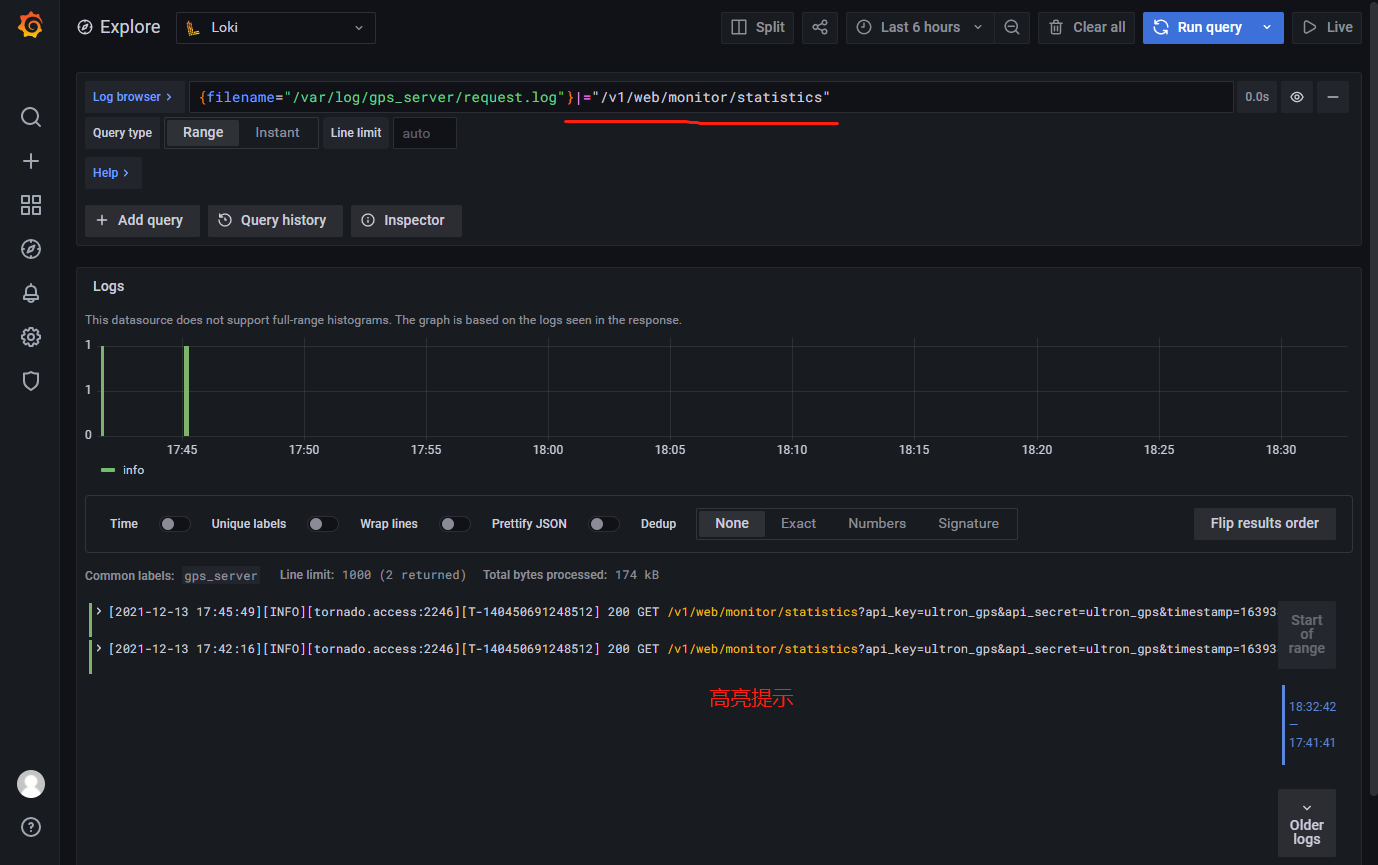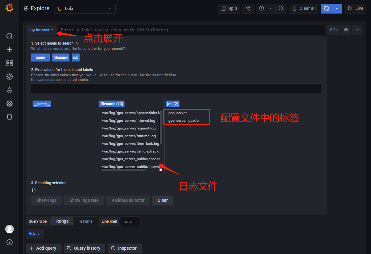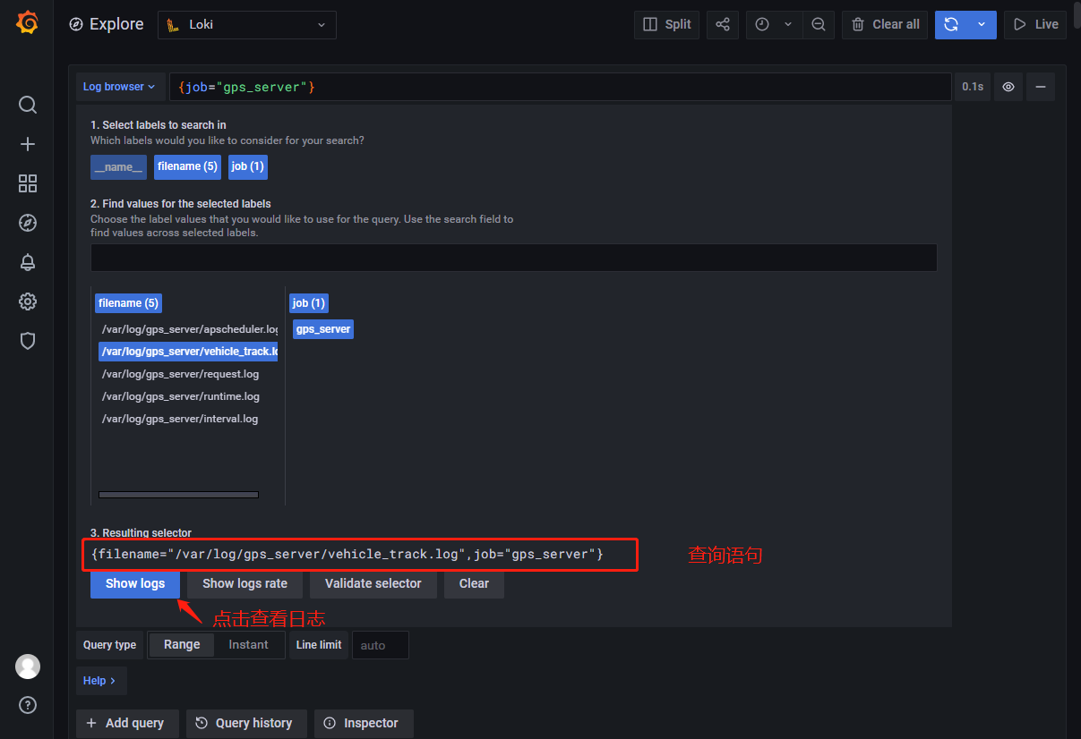 例如下面这个查询语句表示的就是查询 job 标签为 gps_server 中的 /var/log/gps_server/request.log 文件