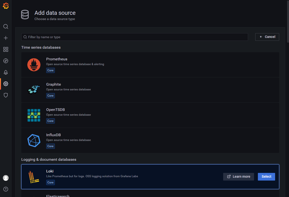 [root@javaedge-car-receiver-test etc]# 进入Grafana,选择 Configuration -> Data sources -> Add data source 进入选择页面,找到 Loki