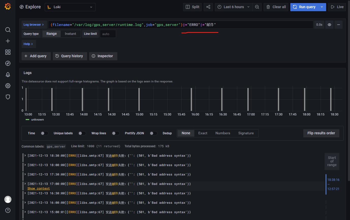 {filename="/var/log/gps_server/runtime.log",job="gps_server"}|="ERRO"|="邮件"