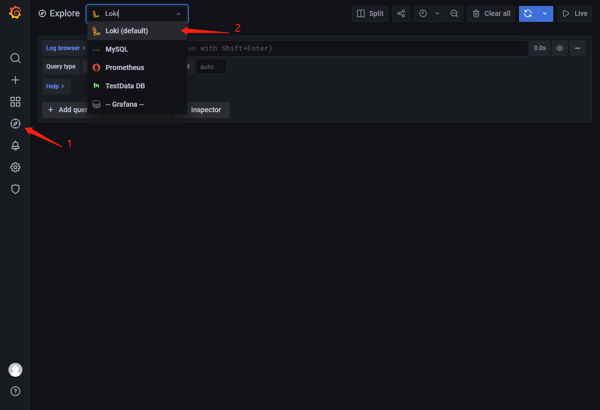 保存成功之后,切换到 Explore 菜单,在顶部选择数据源中就能找到 Loki 了,选中它: