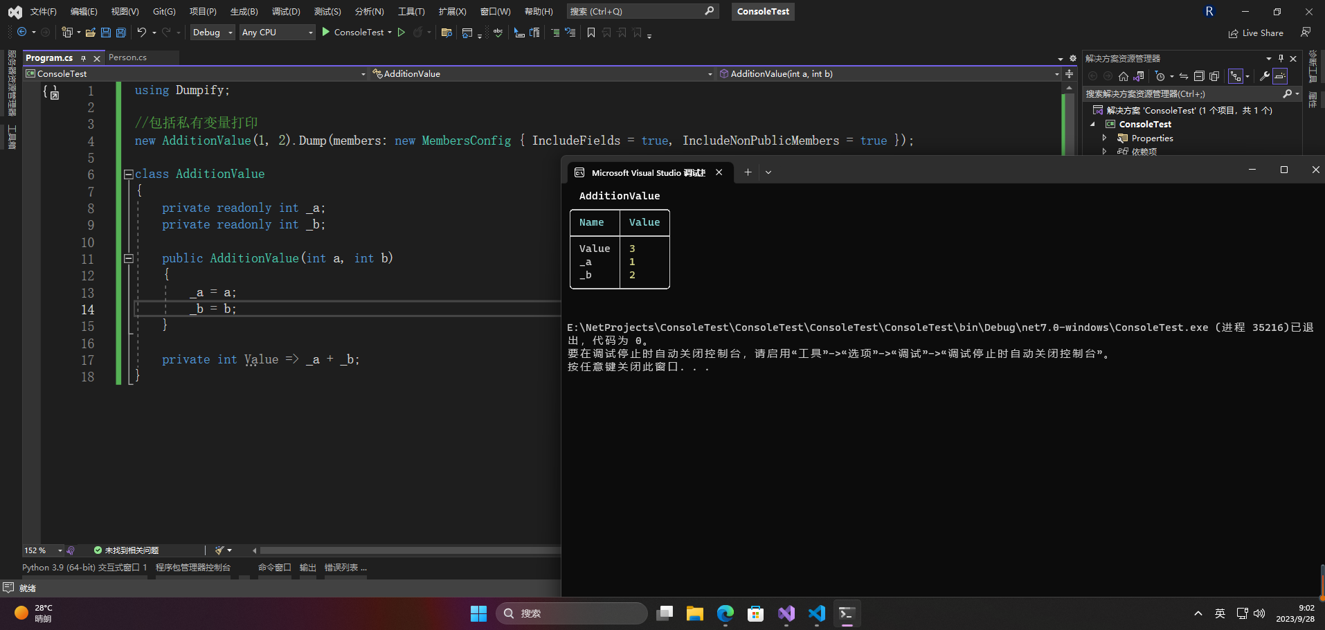 new AdditionValue(1, 2).Dump(members: new MembersConfig { IncludeFields = true, IncludeNonPublicMembers = true });