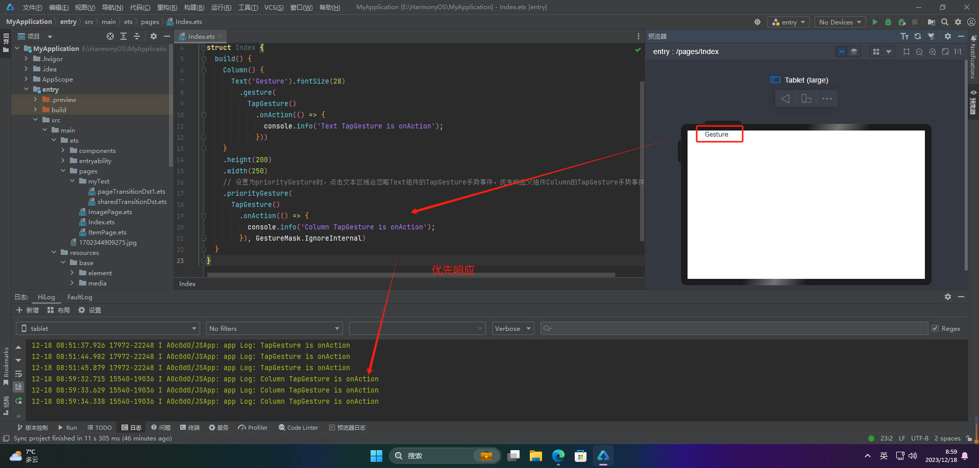 // 设置为priorityGesture时,点击文本区域会忽略Text组件的TapGesture手势事件,优先响应父组件Column的TapGesture手势事件
