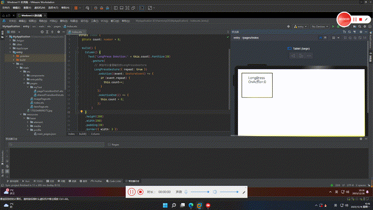 Text('LongPress OnAction:' + this.count).fontSize(28)