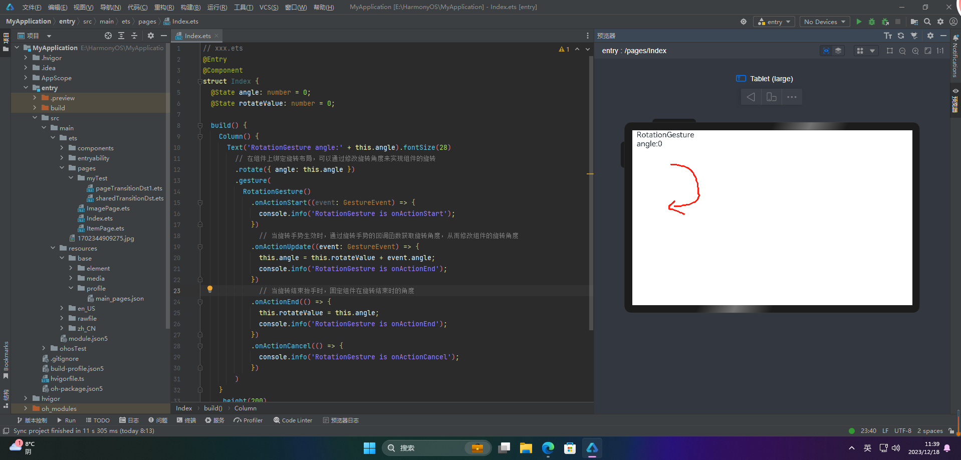 // 当旋转手势生效时,通过旋转手势的回调函数获取旋转角度,从而修改组件的旋转角度