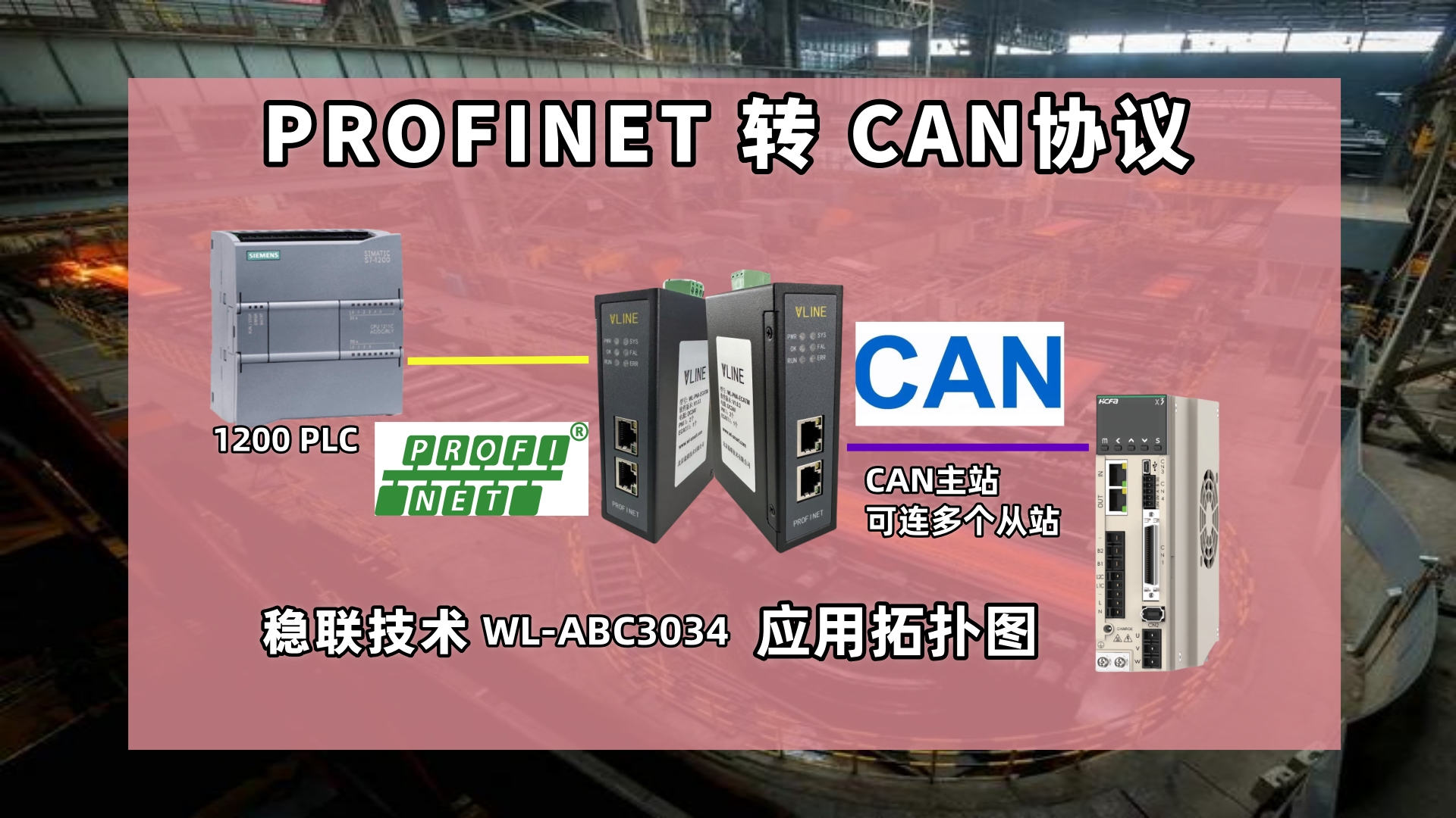 福建三钢炼铁 5 号高炉为 1250m3 高炉,采 用双料车斜桥上料,原有自动化控制系统使用 Profibus-DP 总线控制,故障率高、系统维护量 大。改造中将集中控制的 PLC 进行细化分散控 制,物料输送连接CAN总线设备(如电机驱动器),稳联技术Profinet转CAN 网关控制电机驱动系统。
