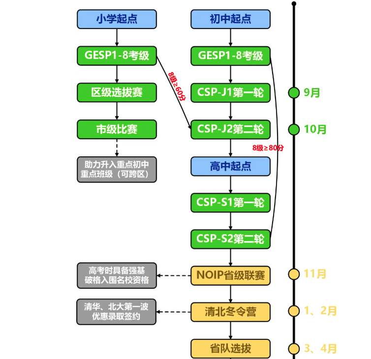 CSP、NOIP、NOI这三个比赛都是由中国计算机学会(CCF)举办的, 代表同学们在编程竞赛上的不同阶段: 1. CSP-J(入门级,Junior) :主要针对小学和初中生 2. CSP-S(提高级,Senior):CSP-S面向高中生 3. NOIP:省选,NOIP名额有限,NOIP是参加NOI的必要条件 4. NOI:国赛,为国争光