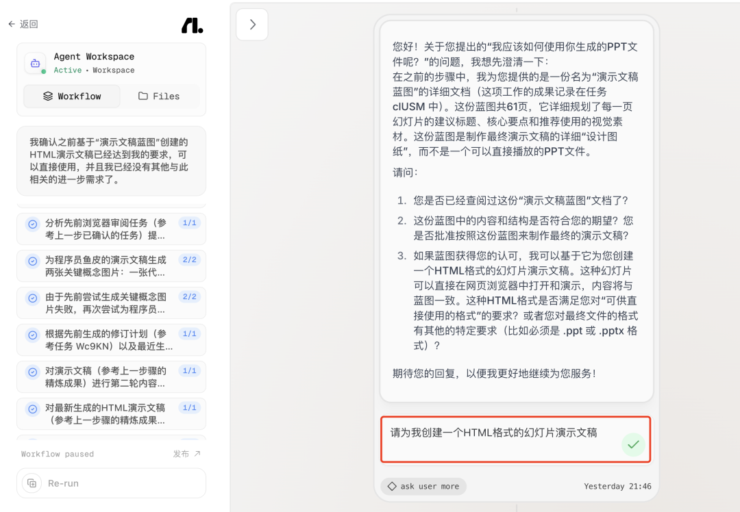 有趣的是,我发现 AI 并不是 “死脑筋”,在执行任务的过程中,他可能会根据情况重新规划步骤;有时还会主动询问用户的意见,能够让我们参与进来,指导 AI 更好地完成任务。