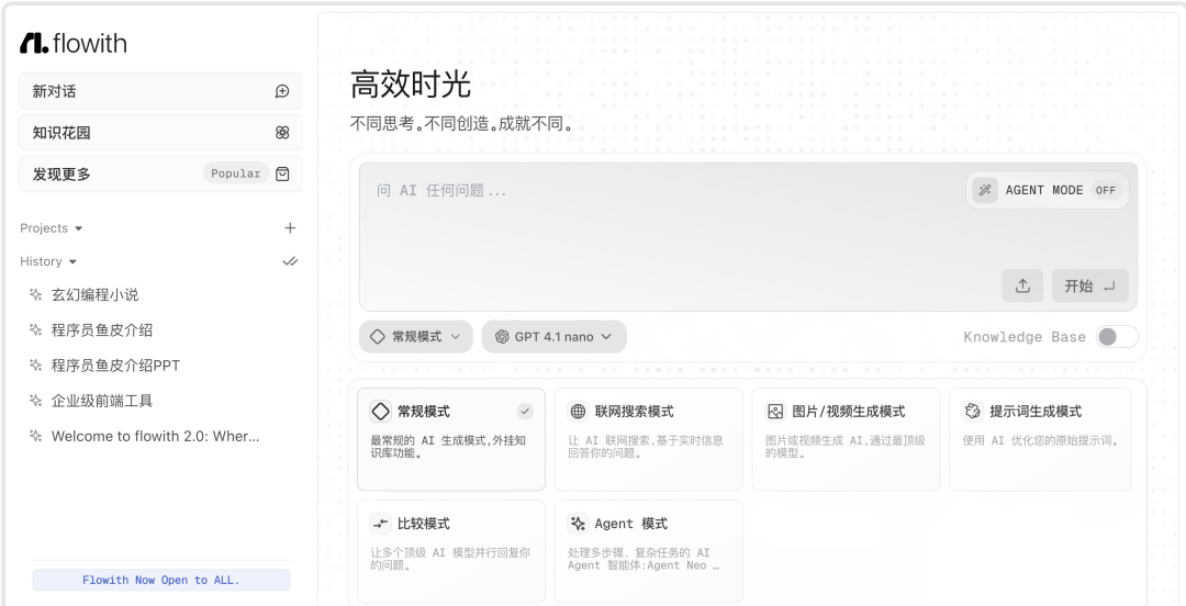 进入 Flowith 主页,看到了熟悉的 AI 对话页面,这是 Flowith 的基础功能,可以生成文本、图片、视频,利用联网搜索工具和自定义知识库来丰富回答的内容。