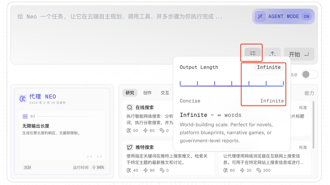 直到这里,Flowith 只是做了大多数 AI 工具都能做到的事情,接下来才是重点。让我们开启 Flowith 的 Agent 模式,也就是能够在云端自主规划任务、调用工具分步骤完成任务的超级智能体。并且开启无限模式,让他一直工作直到完成任务!
