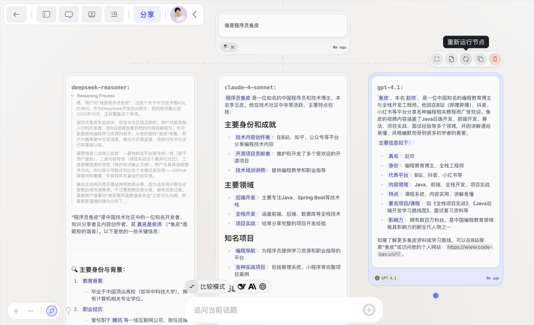输入提示词并发送给 AI 后,我们来到了一个画布页面,看到同一个提示词被发送给了多个 AI,产生了多个工作分支并同时执行。这是 Flowith 的核心特征 —— 工作流,可以清晰地展示每一个具体的工作步骤,并且支持重新运行单个节点、新增节点、自由编辑等功能。