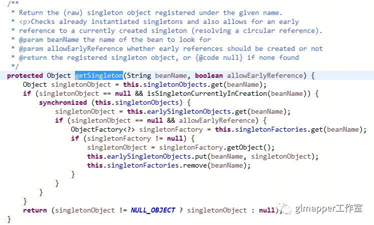 OK,这里我们看到了获取单例实例的具体实现过程。 返回注册在给定名称下的(原始的)singleton对象。检查已经实例化的单例,并且还允许提前引用当前创建的单例(解析循环引用)。