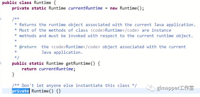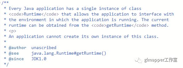 看过上篇文章的小伙伴可能比较清楚,这里RunTime使用的是懒汉式单例的方式来创建的。Runtime提供了一个静态工厂方法getRuntime方法用于获取Runtime实例。Runtime这个类的具体源码分析和只能此处不做分析。