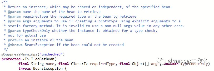 从上面这张图中我们啥也看不出,只知道在getBean中又调用了doGetBean方法(Spring中还有java源码中有很多类似的写法,好处在于我们可以通过子类继承,继而编写我们自己的处理逻辑)。OK,再来看看doGetBean方法。