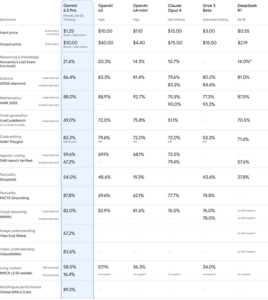 另外,Gemini 2.5 Pro 的定价也很有优势,比 OpenAI o3、Claude 4 Opus 及 Grok 3 等主要竞争对手都更加便宜。