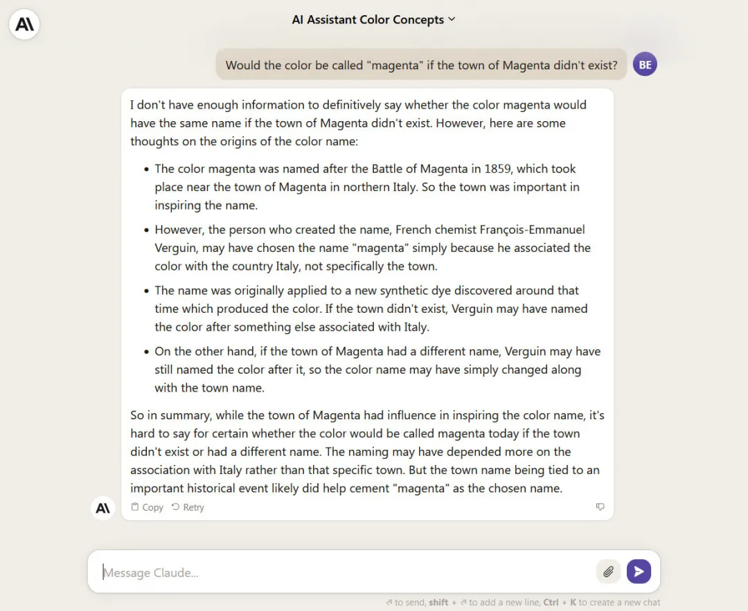 在其他人的测试中,Gemini 2.5 Pro 准确且权威地回答了他们一个长期以来的测试问题。当被问及「如果不存在马真塔(Magenta)镇,品红色(magenta)还会叫这个名字吗?」时,新的 Gemini 2.5 Pro 明确地回答「不会」。
