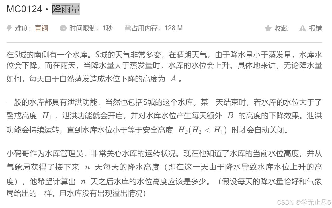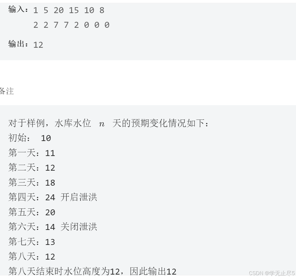 注意:必须要判断H水位在哪一天是否小于等于0,如若已经小于等于0了,则将H按0进行接下来的天数计算,不然会有五个案例报错