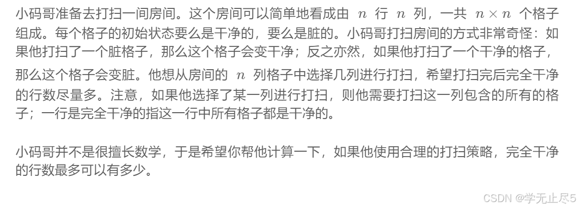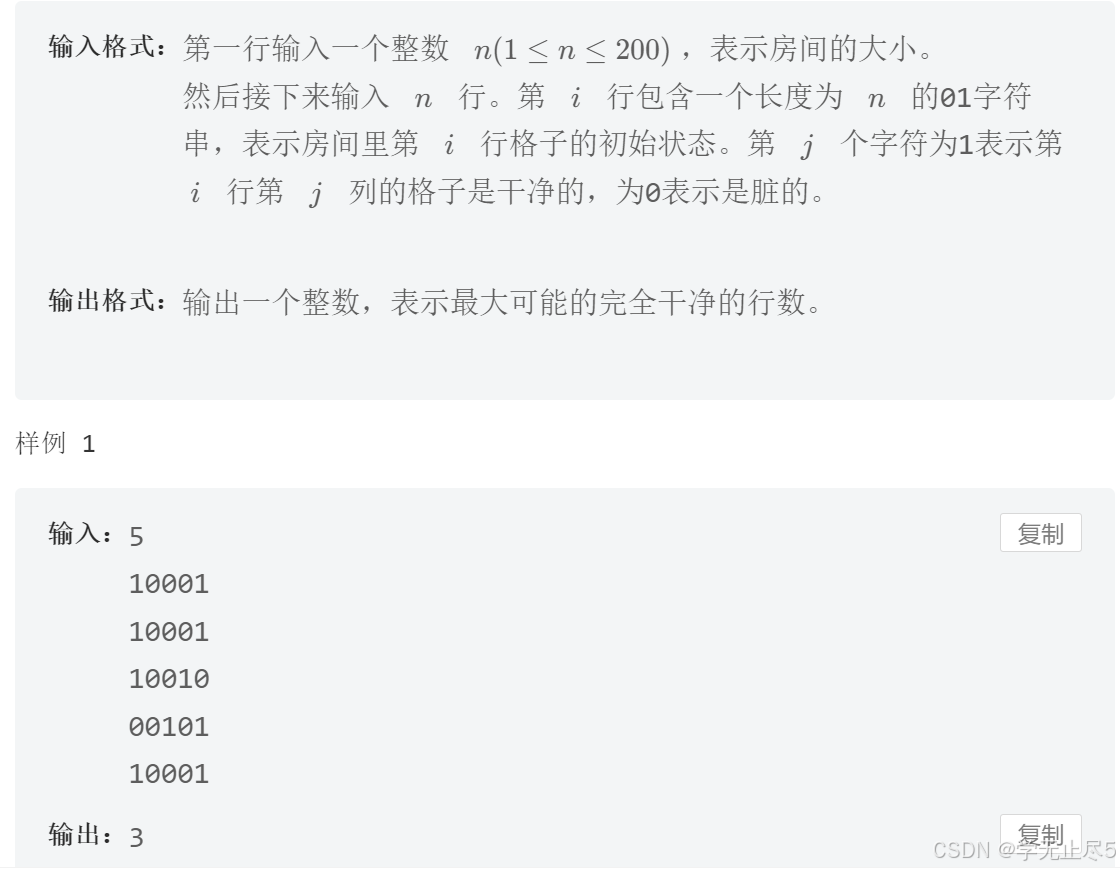 思路:要想要最多的完全干净的行数,则只需要统计行数中字符串相同的最大数