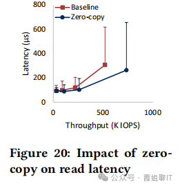图 20 显示,在数据路径上避免内存拷贝可同时提升吞吐量(峰值吞吐量从 520 K IOPS 增至 730 K IOPS)和降低延迟(峰值吞吐量下的中位延迟从 310 微秒降至 260 微秒)。
