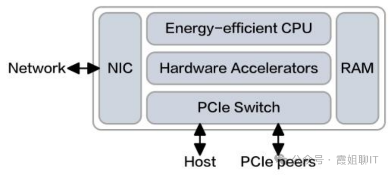 DPU位于系统总线PCIe上,这是访问SSD的最快路径,并且直接与网络接口连接。