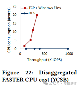 图 22 显示,集成 DDS 的 FASTER 实现了 970千次操作/秒的吞吐量,且无需消耗任何主机 CPU 资源。得益于其高效的 DPU I/O 栈,DDS 的延迟降低了一个数量级。