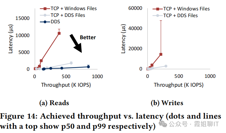 写入延迟如图 14b 所示。基准方案的写入尾延迟高得惊人,在达到 210 K IOPS 时为 48 毫秒。用 DDS 文件取代 Windows 文件效果显著 —— 在吞吐量更高(290 K IOPS)的情况下,尾延迟更低(3 毫秒)。