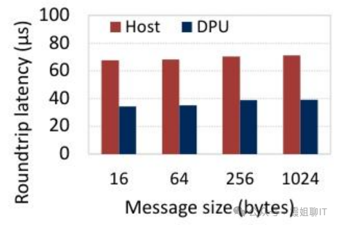 下图记录了不同消息大小下,主机服务器响应消息与DPU 直接响应时的消息的往返延迟。可以观察到,DPU 通过避免将消息转发至主机,可将延迟减半。