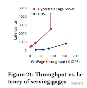 如图21 所示,它还改善了页面服务延迟:页面服务器在达到 90 K IOPS 时,p99 延迟为 4.4 毫秒,而使用 DDS 达到 160 K IOPS 时,仅产生 1.3 毫秒的延迟。