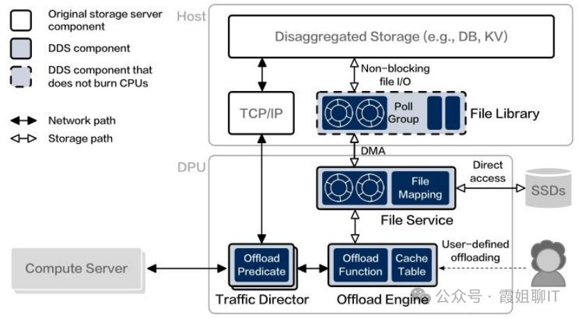 b.提出了一种新架构DDS,通过将存储解耦数据系统中的主机存储操作卸载到 DPU,以降低其成本和延迟