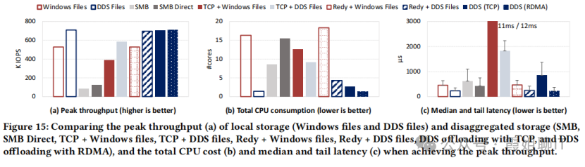 当操作系统开销被消除后,分离式存储的峰值吞吐量可达到与本地存储相同的水平(⑧-⑩ 与②对比)。