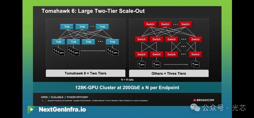 ◆ Scale-Out:通过200G链路的两层Clos架构,可连接超10万个XPU,相比传统三层架构减少67%的光模块与物理连接,降低延迟与功耗。