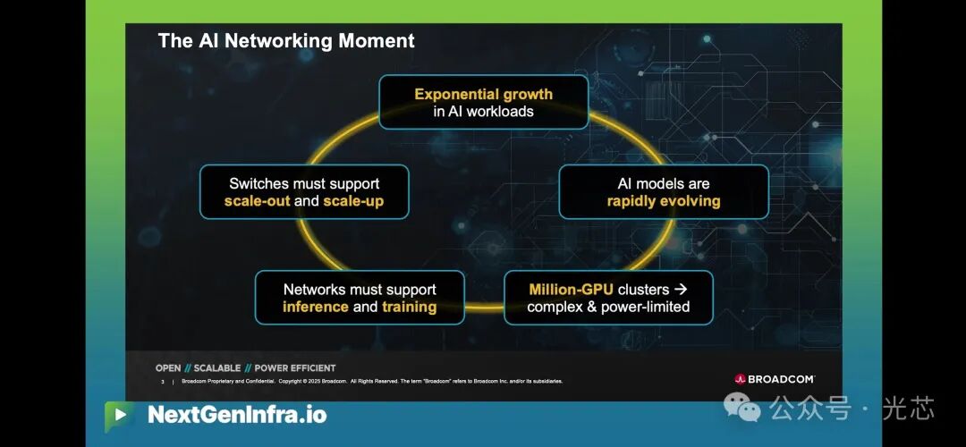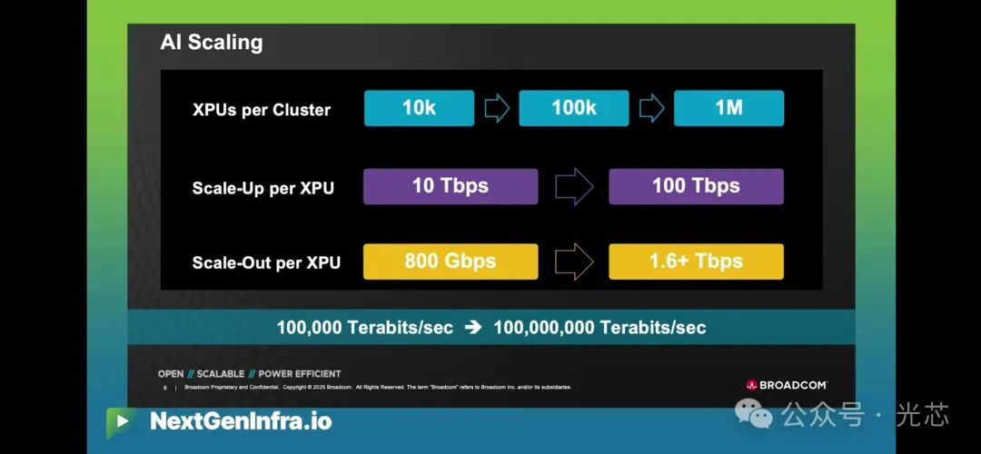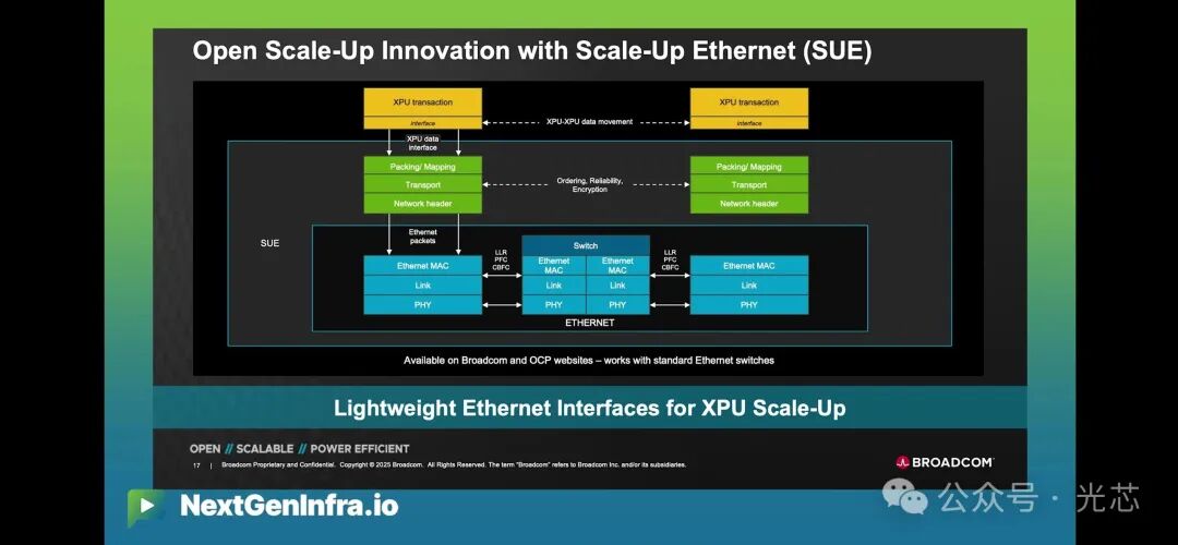◆ SUE框架与OCP合作:2025年4月在OCP大会上发布Scale Up Ethernet(SUE)框架,提供XPU与NIC向上扩展接口的开放规范,推动以太网在机架内场景的标准化。Broadcom报告:以太网重构 AI 分布式计算架构