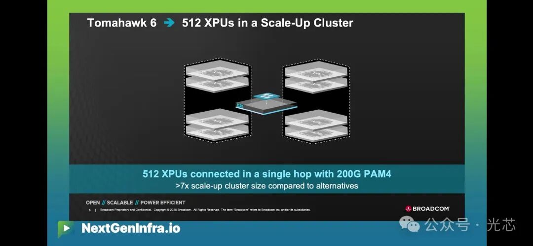 ◆ Scale-Up:单芯片支持512个XPU单跳连接,规模为竞品的7倍,适用于机架内紧密集群的GPU/TPU互连,满足缓存一致性与内存传输需求。