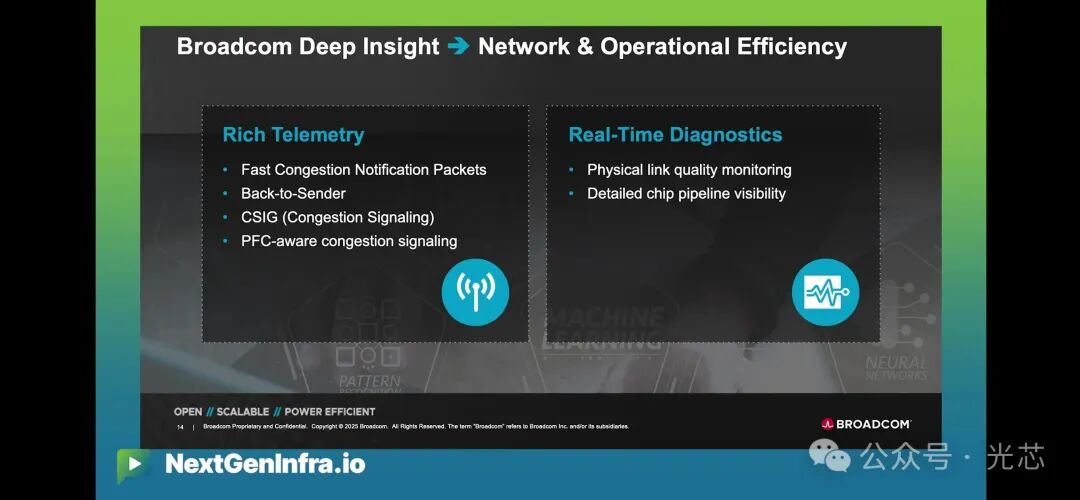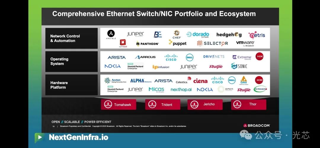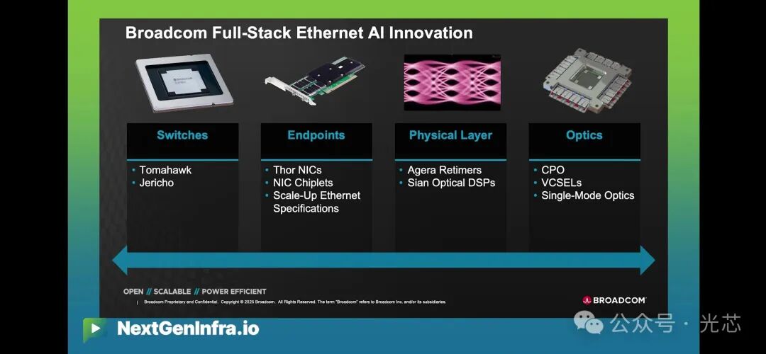 ◆ 端到端产品矩阵:整合Tomahawk 及Jericho交换机、Thor NIC、Agera重定时器、Sian oDSP及CPO技术,形成从芯片到光学的全栈解决方案。其中,Jericho系列聚焦“交换机调度”架构,Tomahawk则面向“端点调度”,配合Thor NIC与小芯片技术,满足不同客户的智能分配需求。
