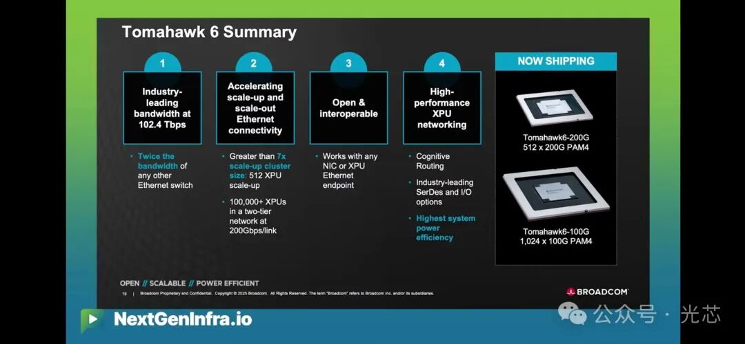 2025年6月3日,博通(Broadcom)正式发布Tomahawk 6交换机芯片系列,成为全球首款单芯片具备102.4 Tbps交换容量的解决方案,带宽达到市场现有以太网交换机的两倍。这一突破直接瞄准下一代AI集群的核心需求——从数十个加速器扩展至数千甚至超百万XPU的规模时,网络带宽与低延迟成为关键瓶颈。