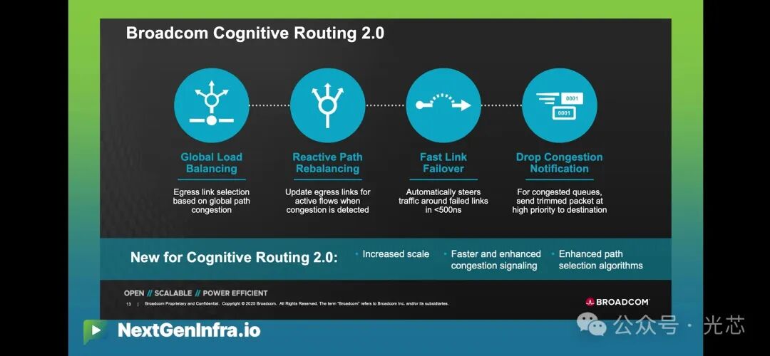 Tomahawk 6搭载的认知路由2.0(Cognitive Routing 2.0)专为现代AI工作负载(如混合专家模型MoE、强化学习等)设计,集成多项关键功能: