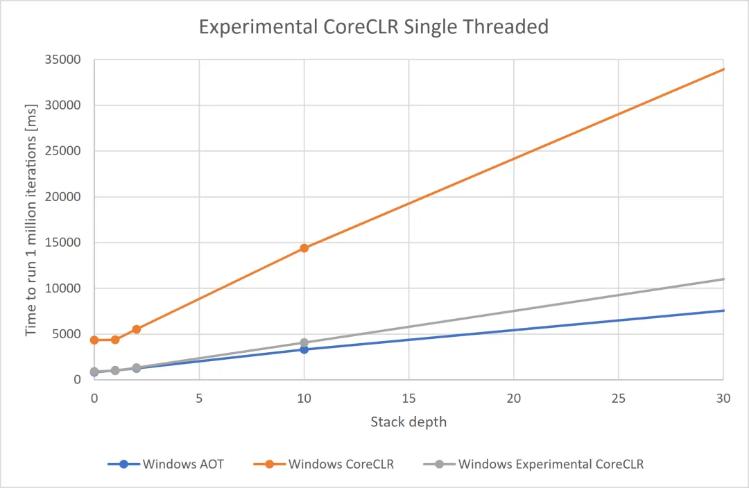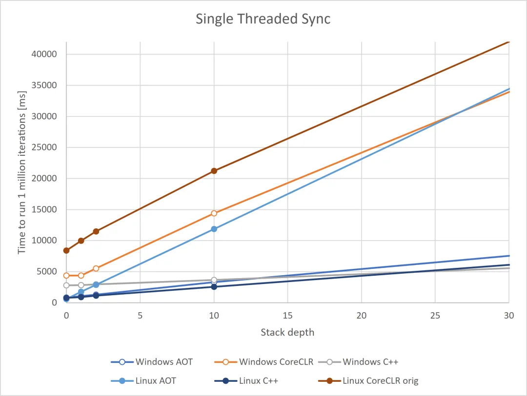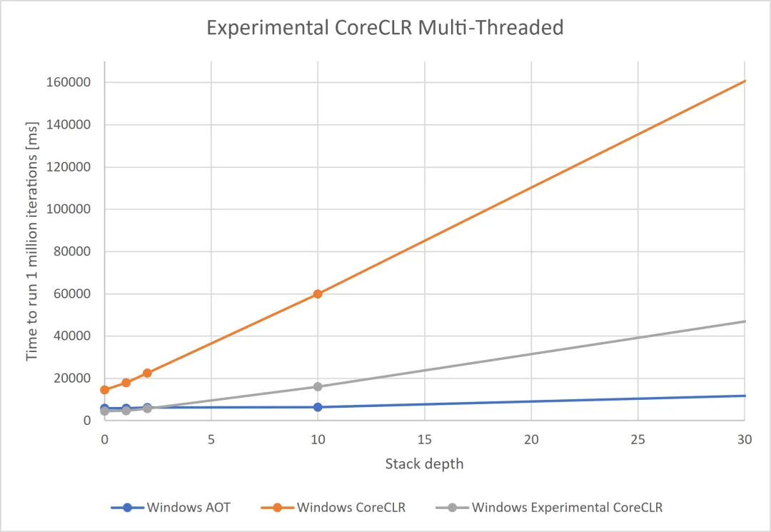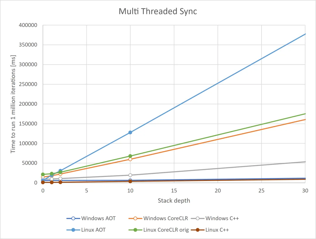 以下是.NET9以前多线程和单线程异常抛出耗时,可以看到随着堆栈深度的增加,抛出异常要花费的世界越来越长。