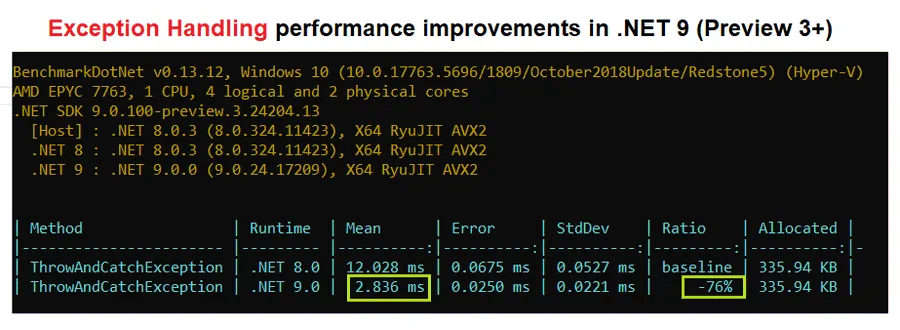 .NET 的异常抛出/捕获速度相较慢得多。但到了.NET 8后期和.NET 9,基准成绩已翻天覆地: