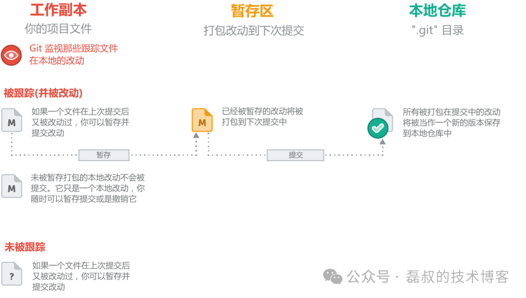 理解 Git 跟踪状态最直观的方法是理解这三层结构: