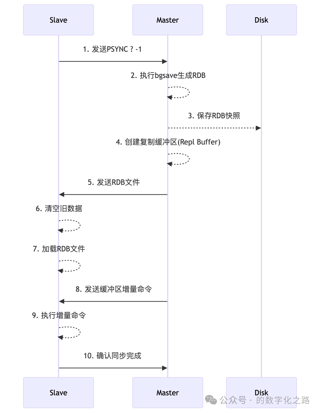 全量同步(Slave初次连接。当从节点首次连接主节点,或复制ID不匹配时触发)
