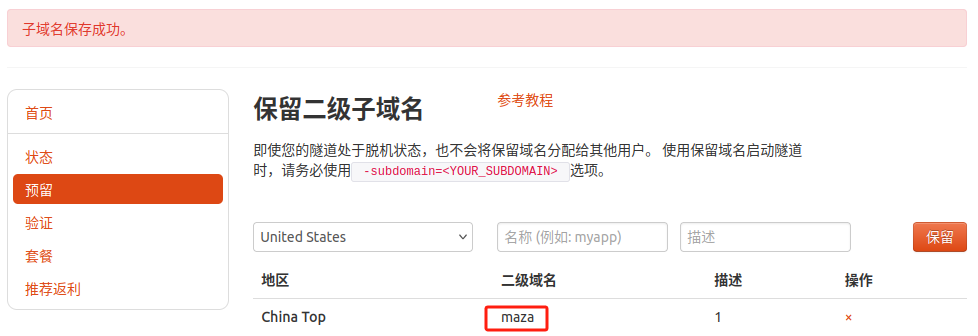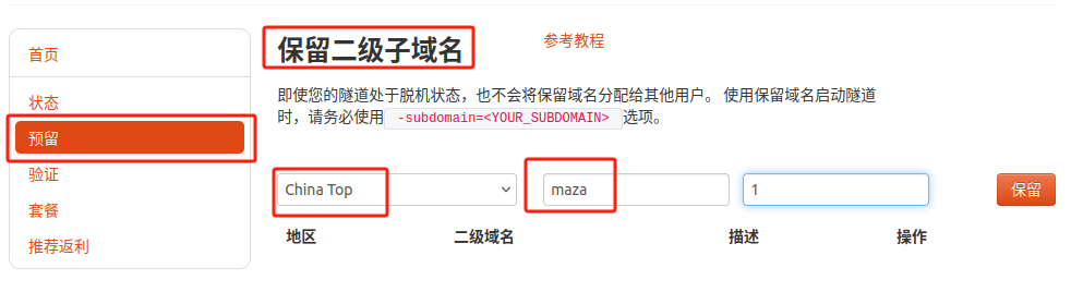 点击左侧的预留,选择保留二级子域名,地区选择china top,然后设置一个二级子域名名称,我这里演示使用的是maza,大家可以自定义。填写备注信息,点击保留。