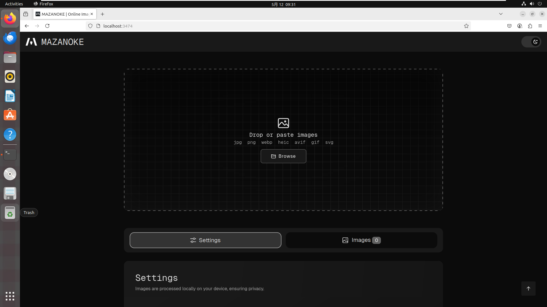 部署完毕以后打开浏览器,输入http://localhost:3474就能打开MAZANOKE的主页面了。