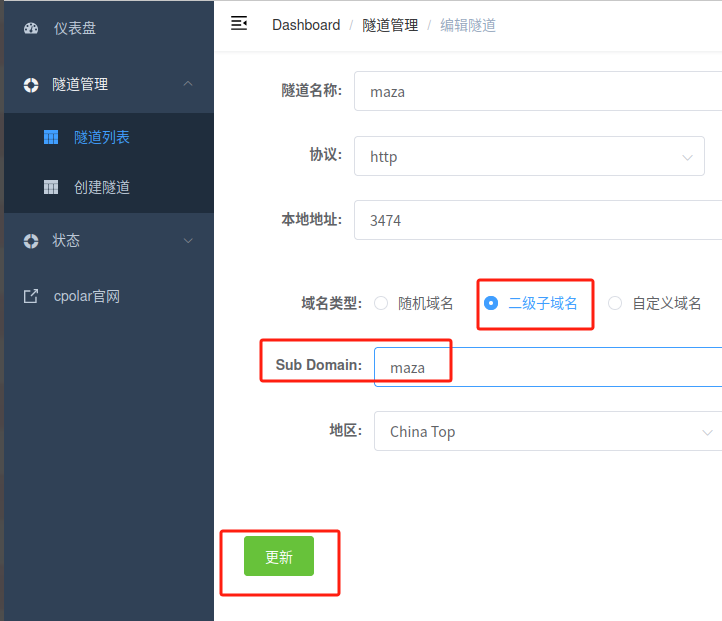 修改隧道信息,将保留成功的二级子域名配置到隧道中