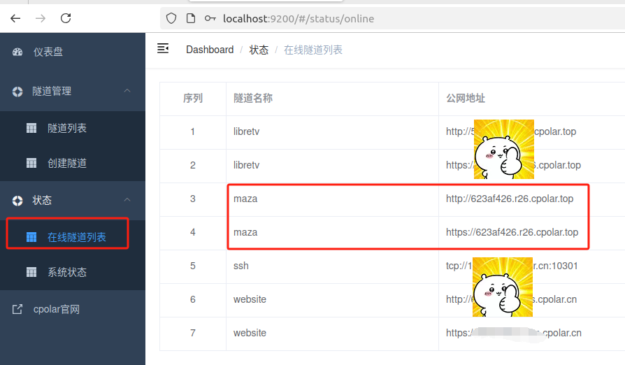 更新完成后,打开在线隧道列表,此时可以看到随机的公网地址已经发生变化,地址名称也变成了保留和固定的二级子域名名称。