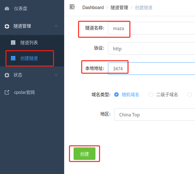 登录cpolar web UI管理界面后,点击左侧仪表盘的隧道管理——创建隧道: