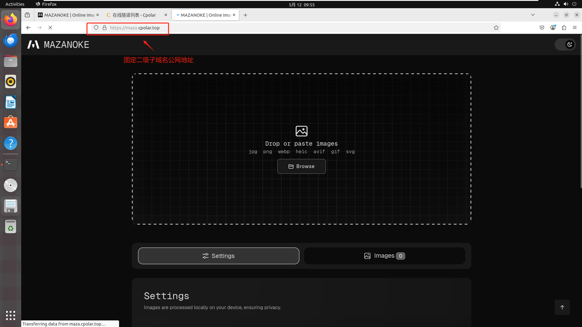 最后,我们使用固定的公网地址在任意设备的浏览器中访问,可以看到成功访问本地部署的MAZANOKE页面,这样一个永久不会变化的二级子域名公网网址即设置好了。