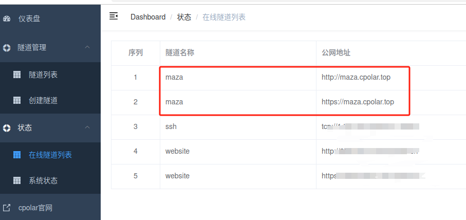 创建成功后,打开左侧在线隧道列表,可以看到刚刚通过创建隧道生成了两个公网地址,接下来就可以在其他电脑或者移动端设备(异地)上,使用任意一个地址在浏览器中访问即可。