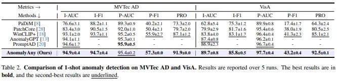 在MVTec AD和VisA上,AnomalyAny都在多个指标上刷新SOTA: