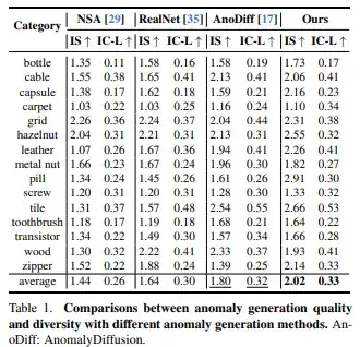 结果显示,AnomalyAny在平均IS和IC-LPIPS上全面领先,明显优于当前主流方法(如NSA、RealNet、AnomalyDiffusion):